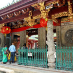 寺院は伝統的な中国南部の建築様式で建てられました。建物の構造全体が釘なしで組み立てられています。石、タイル、木材、龍や鳳凰の複雑な彫刻、存在感のある柱が組み合わさった建築の傑作です。1907年に清朝の皇帝グァン・スーによって与えられた波靖南溟 “Bo Jing Nan Ming”(南海に優しい波)という言葉が刻まれた銘板があります。